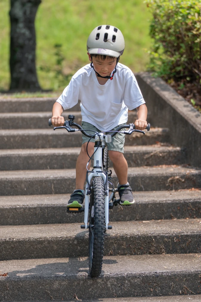 多くの自転車は安定した走行に重点を置いている車体が多いです。ただ、ヨツバサイクルは「スポーツ走行」に振っています。ヨツバサイクルは移動手段という自転車の枠から飛び出た、「自転車遊びの自転車」です。それはつまり、スポーツ走行と呼ばれる坂を下りたり、上ったり。さらにウィリーをしてみたり、階段だって一つの遊び場だったりします。スポーツ走行をする上で、絶対に車体由来の事故が起きるような事があってはならないと考えています。段差や階段を下るといった、普通なら“危ない”と思われる遊びでも、 子供が「車体が原因で怪我をしない」こと”を第一に考え、強度と設計に徹底的にこだわっています。